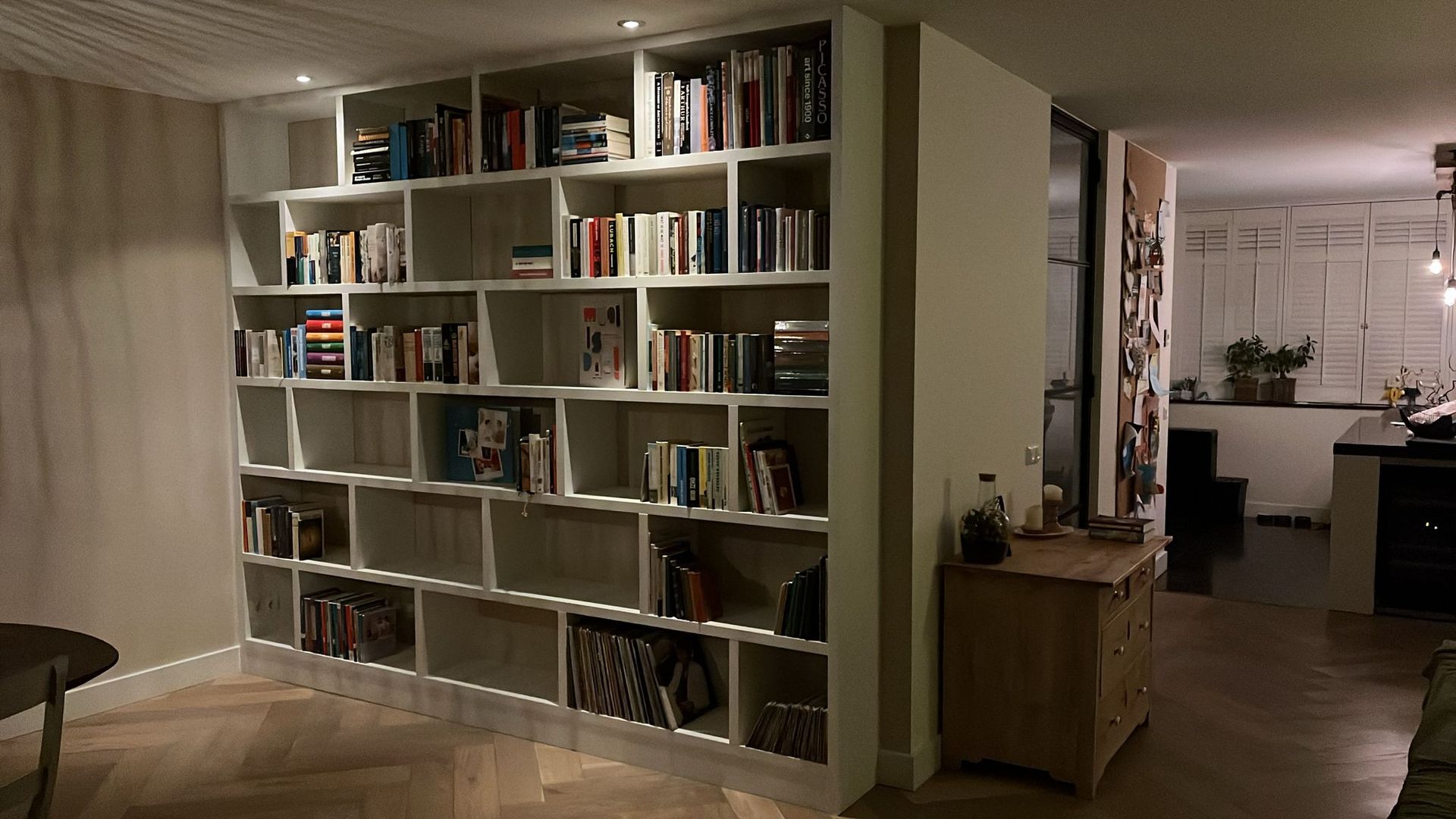 In deze woning is een op maat gemaakte boekenkast gemaakt en een bijpassend meubel voor de LP speler stijlvol te integreren.