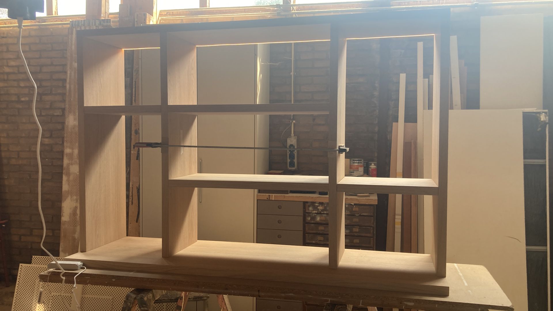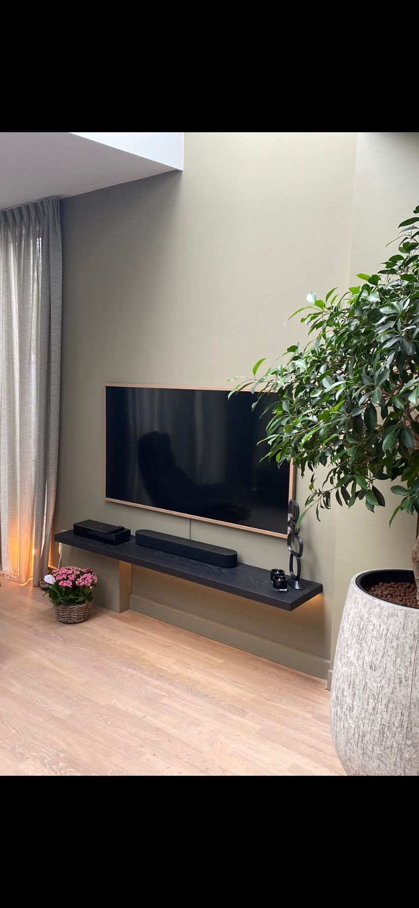 De buffetkast en tv plank zijn op maat gemaakt van extra dik plaatmateriaal met een eikenfineer. Dit is hierna op de gewenste kleur gespoten. Tevens is zowel de plank als de kast voorzien van verlichting.