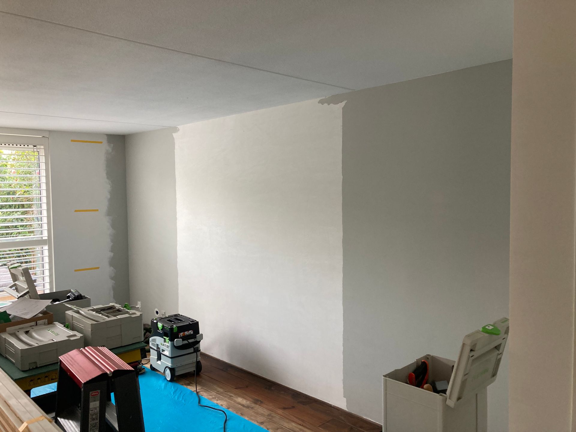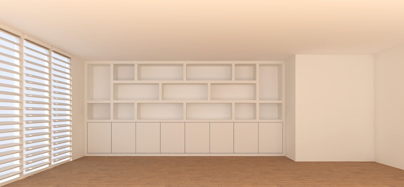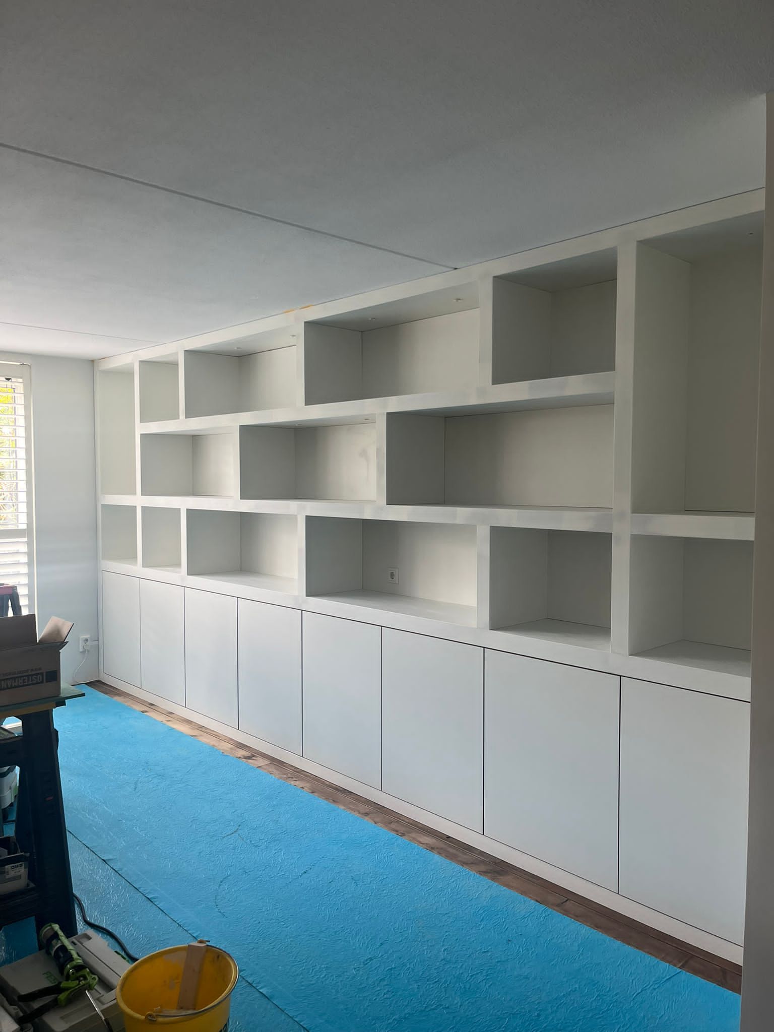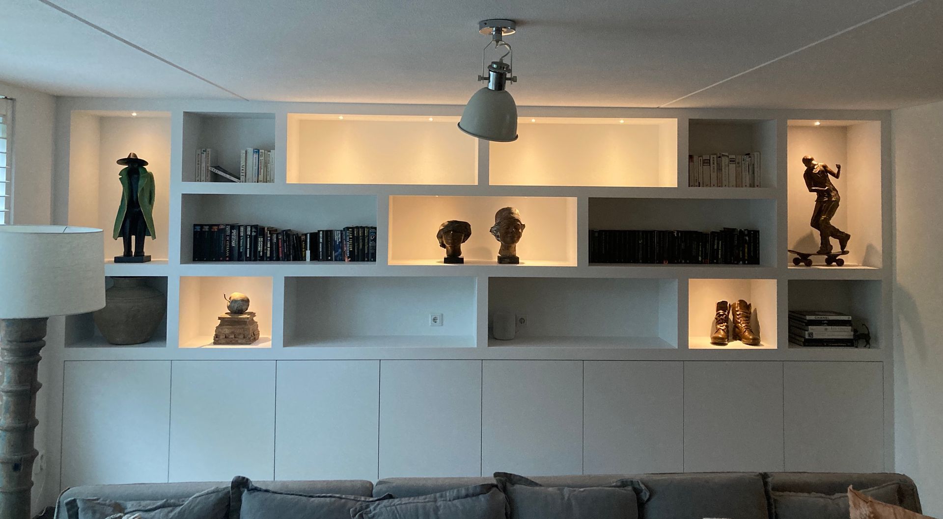 In deze woning hebben we een wandmeubel in de volledige breedte van de woonkamer op maat gemaakt en geplaatst